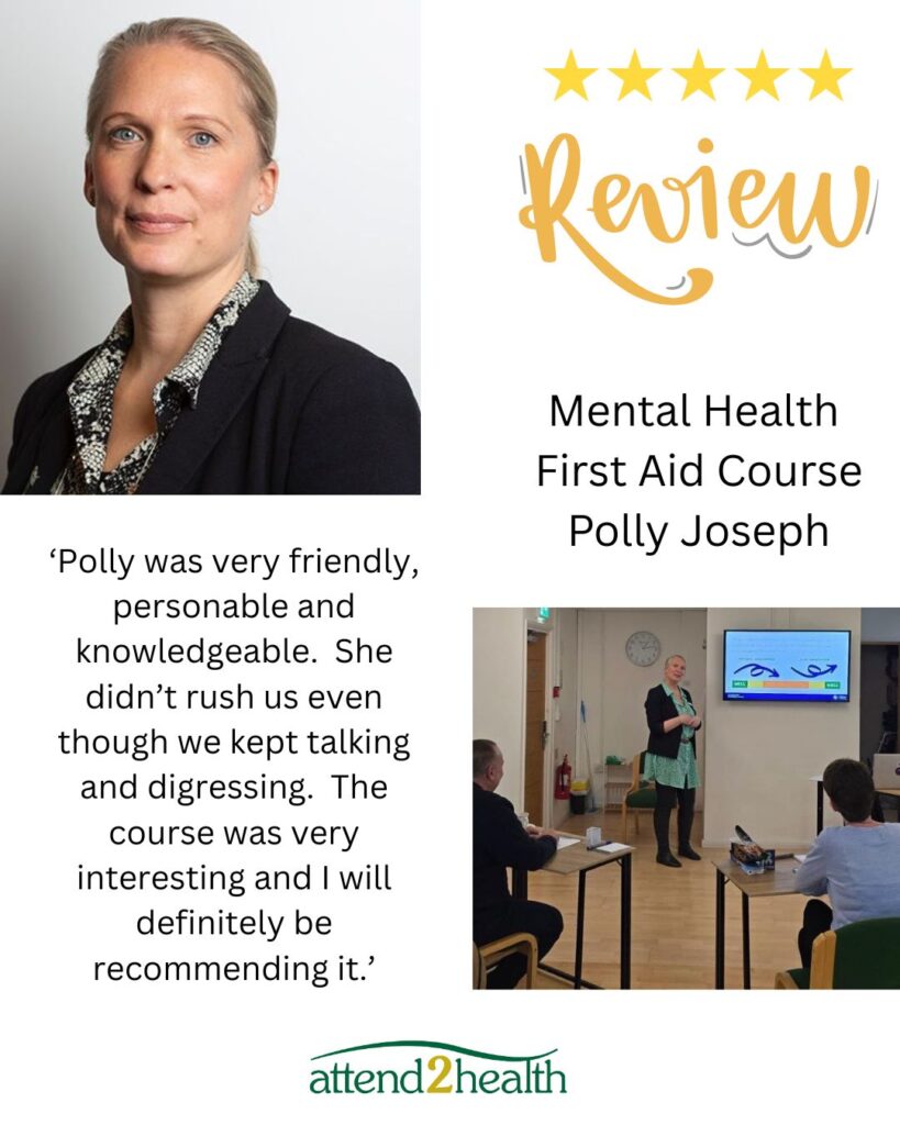On the 13th and 20th March Attend2Health will be holding another Mental Health First Aid Course. This is suitable for anyone wishing to support themselves, their friends or their family with their mental health. It is a certified course valid for 3 years. Here’s a couple of testimonials from the last course…